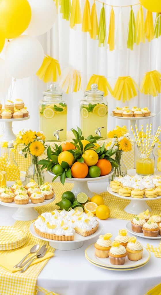 A lemon theme is fresh, bright, and cheerful. Yellow decorations, lemon centerpieces, and citrus-inspired desserts make the party feel lively.