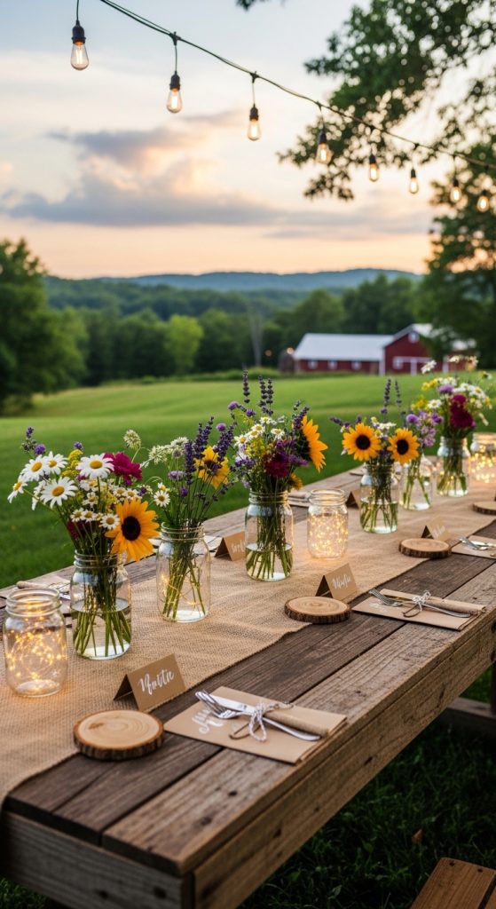This theme works perfectly in barns, gardens, or outdoor spaces. Add fairy lights, candles, and wooden crates for a cozy country look.