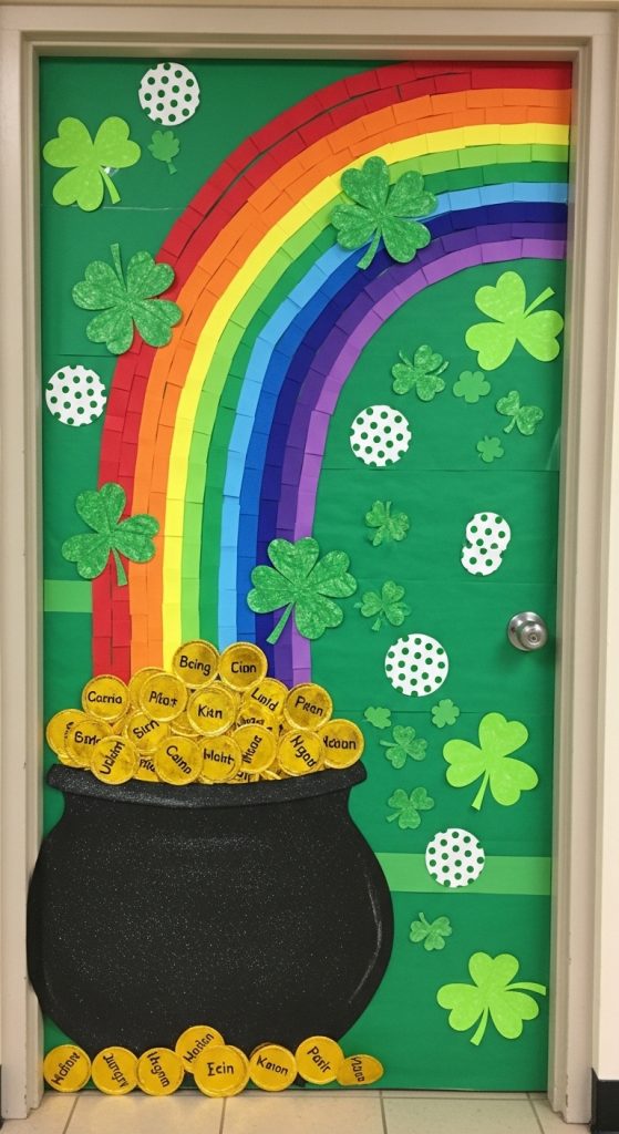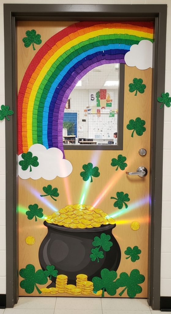 Transform your classroom door into a bright rainbow leading to a pot of gold. Use colorful paper strips to create the rainbow across the door. At the bottom corner, place a large black pot filled with gold coins.