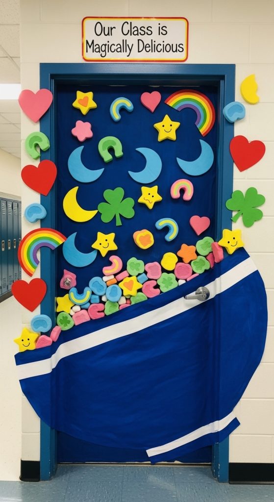 Turn the door into a cereal-themed decoration inspired by lucky shapes. Use colorful cutouts like hearts, stars, horseshoes, moons, and clovers.