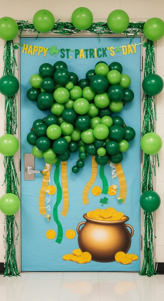 Create large shamrocks using clusters of green balloons attached to the door. Place gold ribbons or paper coins around them.