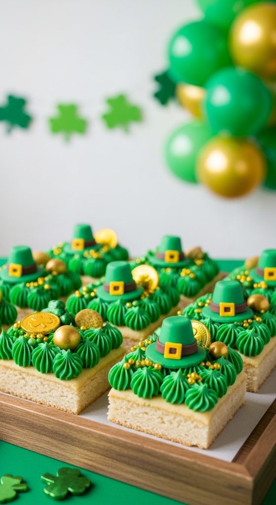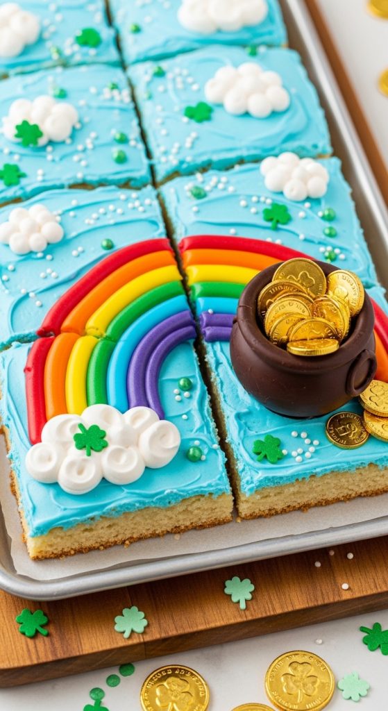 Inspired by the famous Irish legend, these cookie bars feature rainbow decorations leading to a “pot of gold.” Frost the bars with sky-blue icing, pipe a rainbow across the surface, and add chocolate coins at the end.