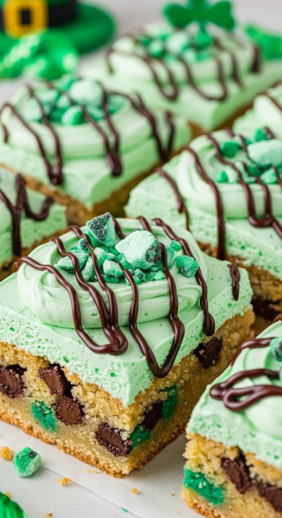 Top them with pale green frosting, chocolate drizzle, and crushed mint candies. The result is refreshing, festive, and perfect for St. Patrick’s Day dessert tables.