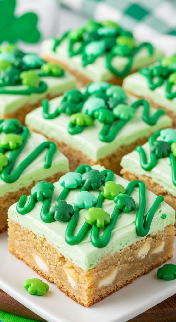 White chocolate pairs beautifully with sugar cookies. These bars include white chocolate chips baked into the dough and are topped with frosting and lucky-themed decorations like shamrock candies and green drizzle.