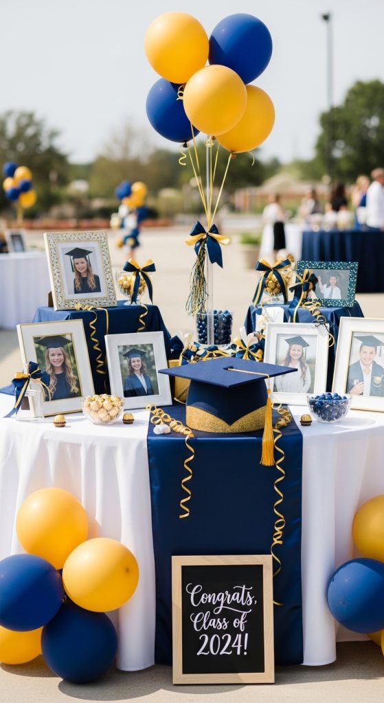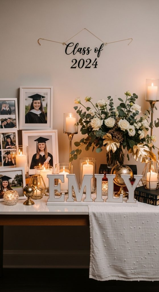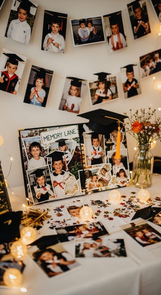 Guests will enjoy walking up to the table and reminiscing about special moments. Adding small captions or dates can make the display even more meaningful. A scrapbook or memory book placed on the table can allow guests to leave notes for the graduate.