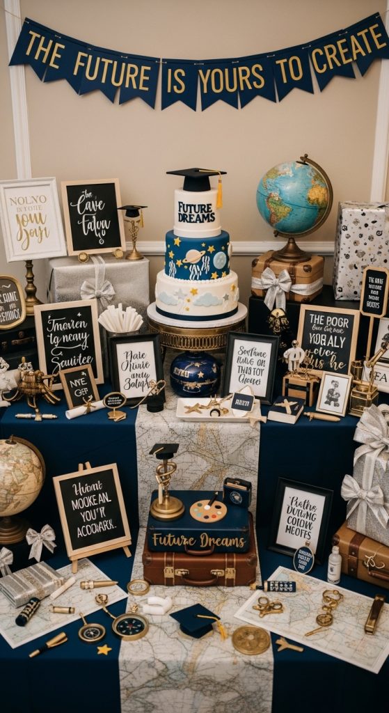 For example, travel-themed décor works great for graduates planning to explore the world. Include maps, suitcases, or inspirational quotes about the future. This makes the table meaningful and motivational.