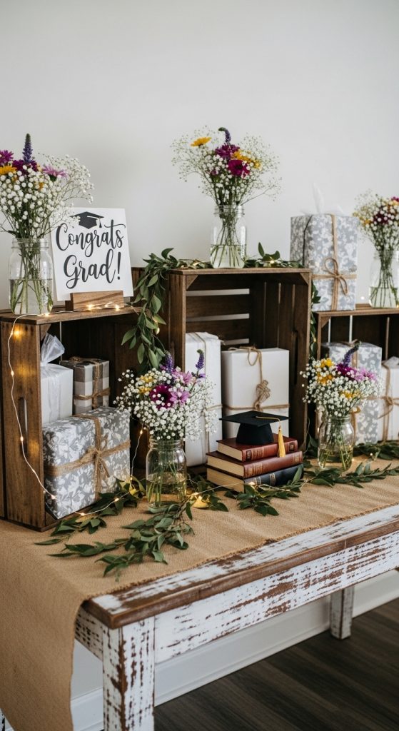 6. Rustic Graduation Gift Table 🌿