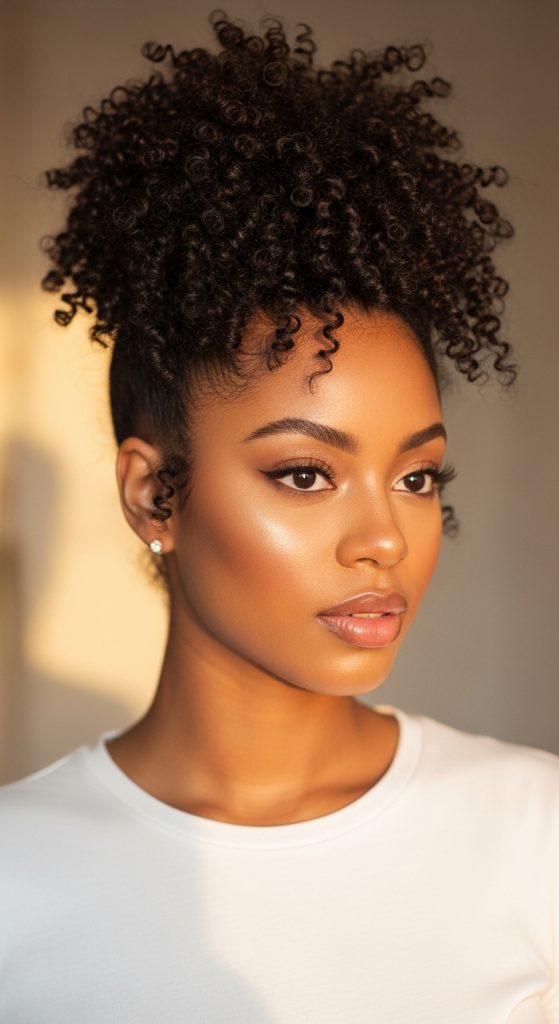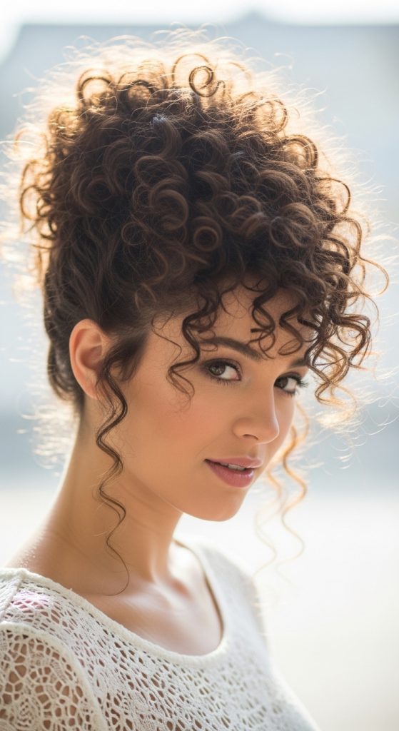 The pineapple updo is a favorite among people with curly hair. Hair is gathered loosely at the top of the head, allowing curls to fall forward naturally.
