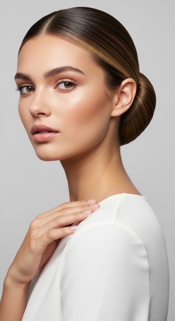 The sleek low bun is perfect for professional settings or formal occasions. The hair is smoothed back and secured into a bun at the nape of the neck.