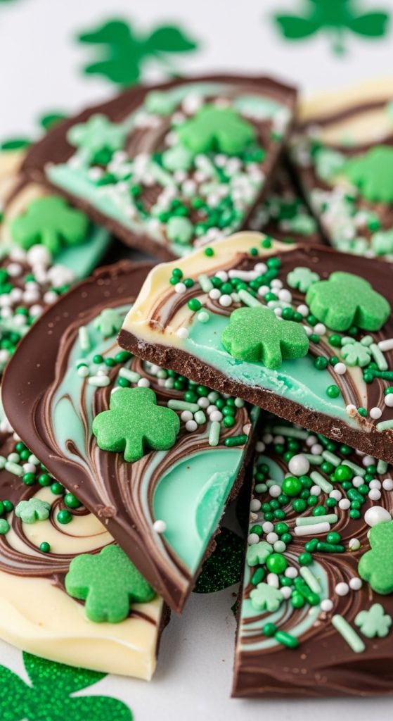 End the party on a festive note with a simple, colorful dessert—lucky mint chocolate bark. Melt white and dark chocolate, swirl together, and sprinkle with crushed mint candies or green sprinkles. Break into irregular pieces for a rustic look. This treat is quick, visually appealing, and perfect for giving guests something sweet to take home.