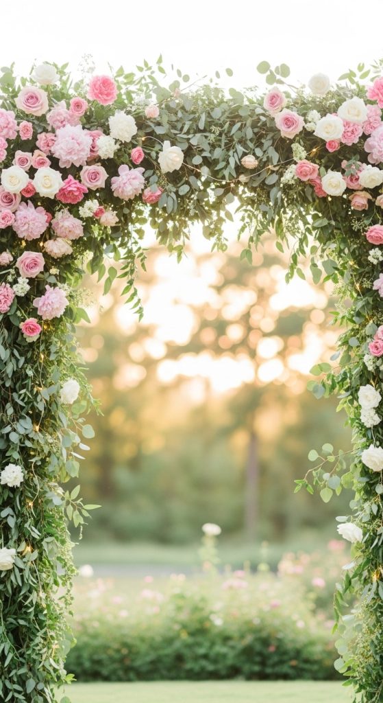 A floral arch covered in roses, peonies, and greenery creates a dreamy fairytale setting. Add soft hanging crystals or fairy lights to enhance the magical effect.