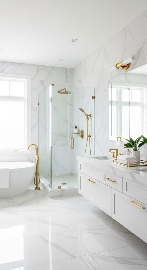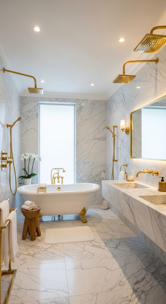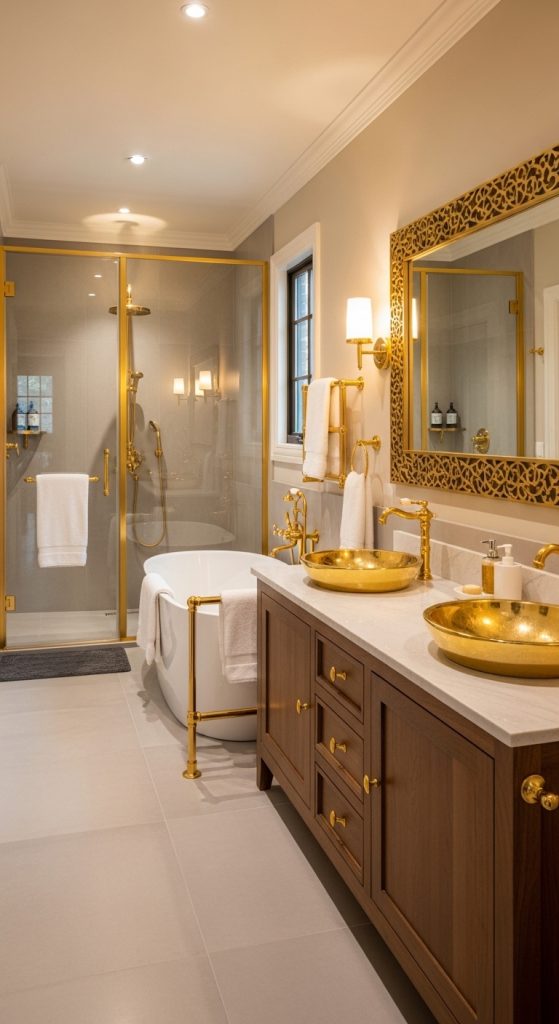 Opt for brushed gold faucets and shower frames to create a spa-like atmosphere. This design is ideal for homeowners seeking a luxurious, hotel-inspired bathroom.