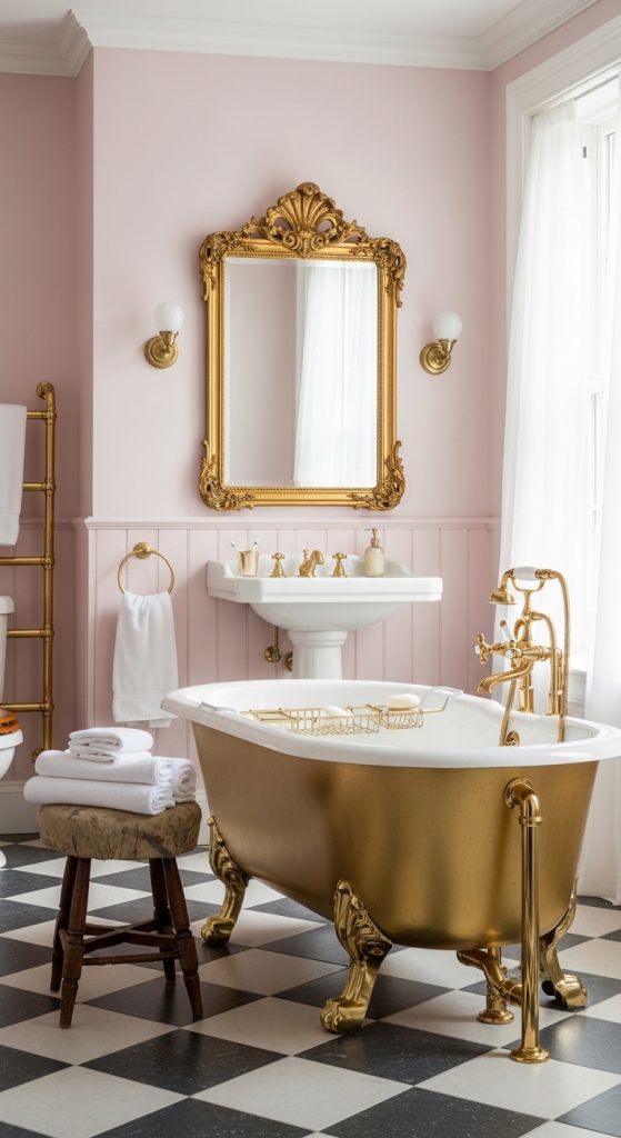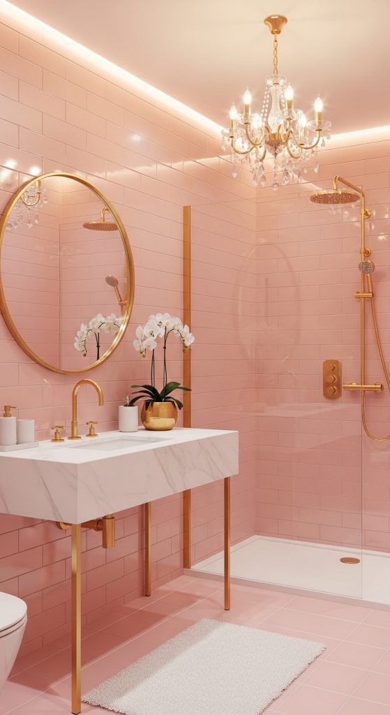 For a feminine and glamorous touch, combine soft pink hues with gold fixtures. Blush walls, rose-toned tiles, or accessories paired with gold create a chic and trendy bathroom.