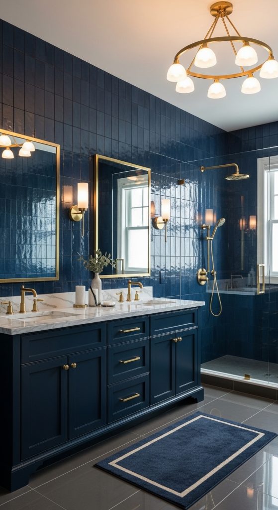 Deep navy blue walls or cabinetry paired with gold fixtures create a rich and elegant atmosphere. The dark tones highlight the warmth of gold, making it stand out beautifully.