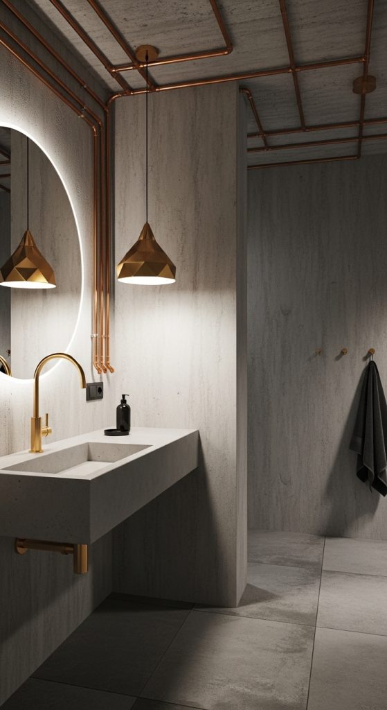 Industrial bathrooms often feature raw materials like concrete, exposed pipes, and metal finishes. Introducing gold fixtures softens the rugged look while adding a touch of luxury.