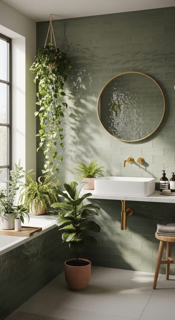 Earthy green tones paired with gold fixtures bring a refreshing and natural vibe to your bathroom. Whether it’s sage green walls or deep emerald tiles, gold accents complement the color beautifully.