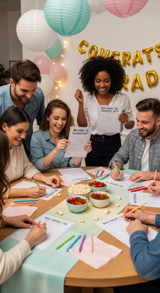 This game is a crowd favorite. Prepare a list of questions about the graduate—favorite food, dream job, biggest fear, or funniest memory. Guests write down their answers, and the person with the most correct responses wins. It’s a great way to highlight the graduate’s personality while letting guests feel more connected.