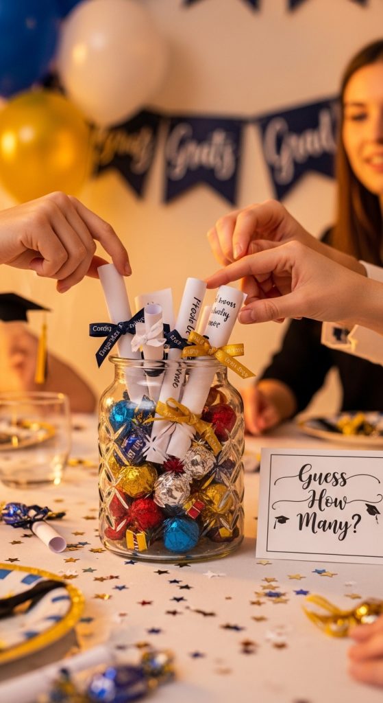 Fill a jar with small notes or candies and let guests guess how many are inside. To make it more meaningful, you can replace candies with folded notes containing memories or wishes for the graduate. This adds a sentimental twist and creates a keepsake the graduate can cherish long after the party ends.