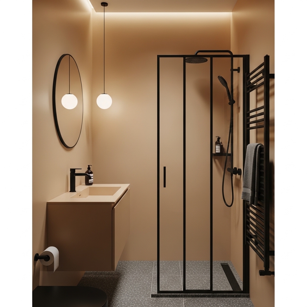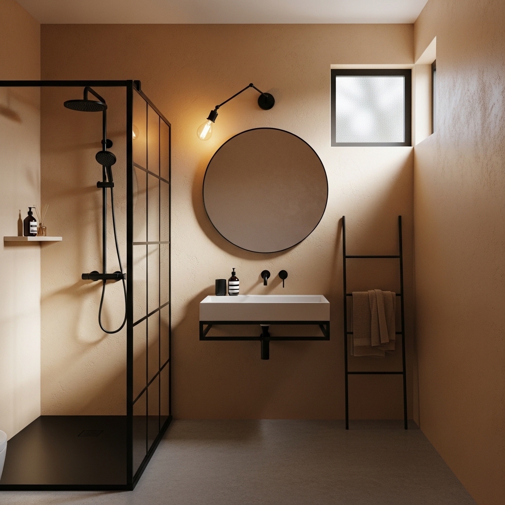If your bathroom includes a shower enclosure, consider black-framed glass panels. This design detail mimics modern industrial style while visually dividing the space without making it feel cramped.