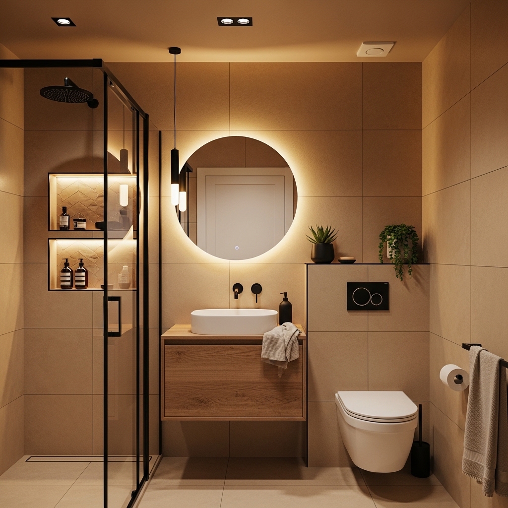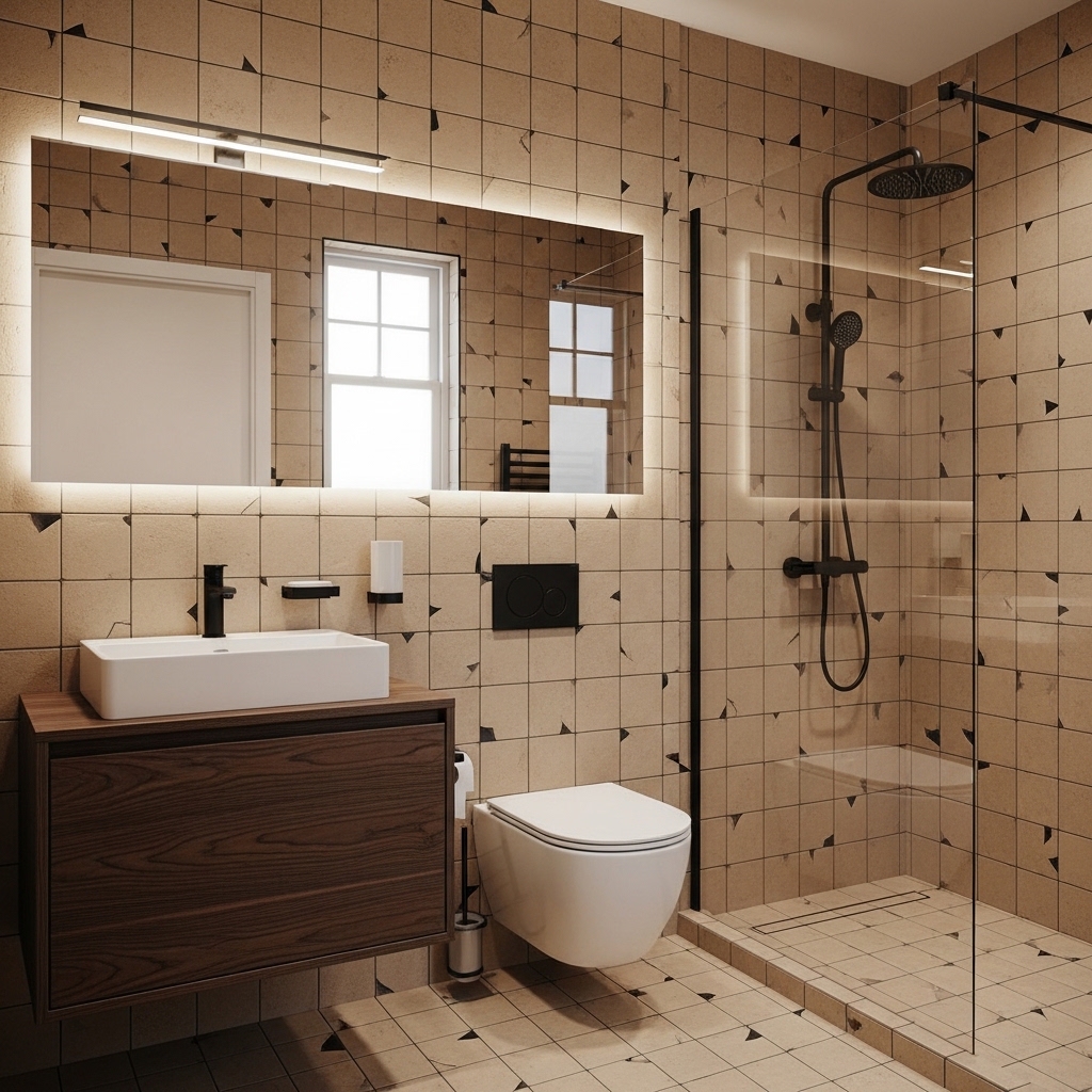 A clever way to bring both colors together is by using tan tiles paired with black grout. This creates a subtle geometric pattern that adds texture and visual interest without overwhelming the space—perfect for small bathrooms.