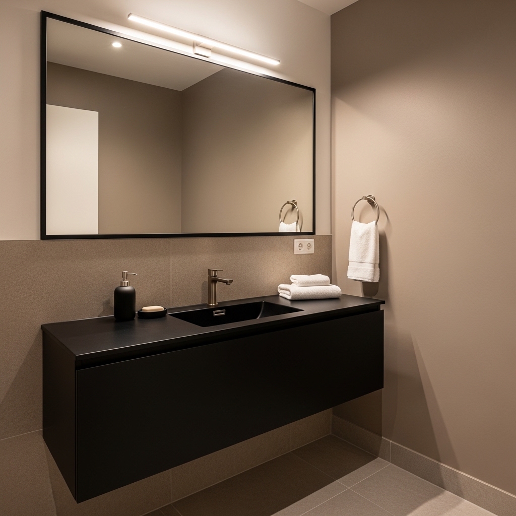 A compact black vanity can serve as the focal point of your bathroom. Pair it with a tan countertop or backsplash to soften the look. This combination balances boldness with warmth, creating a refined aesthetic.