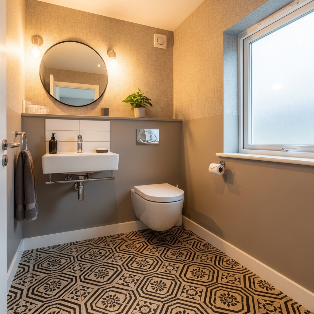 Introduce patterned tiles in black and tan for your flooring. This adds personality and becomes a standout feature, especially in a small bathroom where every design choice counts.