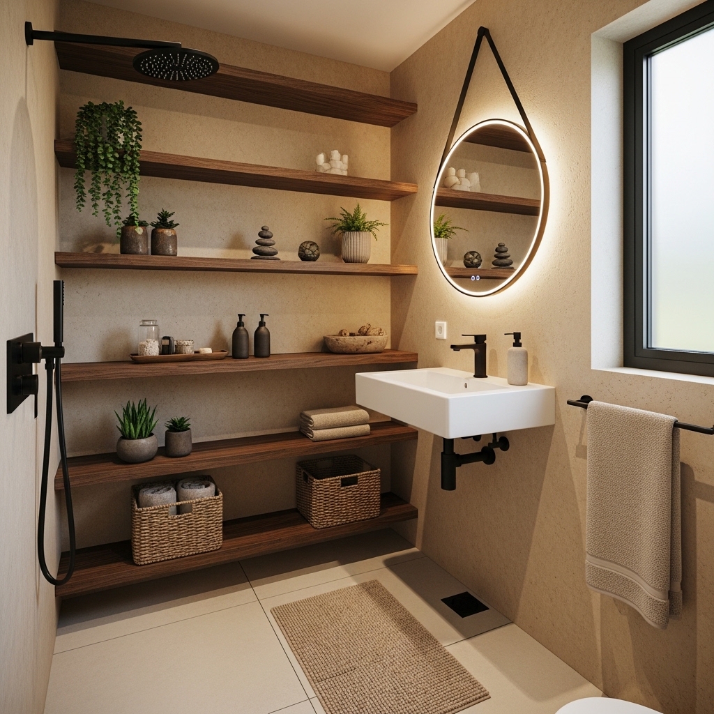 Keep decor simple and intentional. A few well-chosen items—such as tan towels, black soap dispensers, or small plants—can tie the entire look together without cluttering the space.