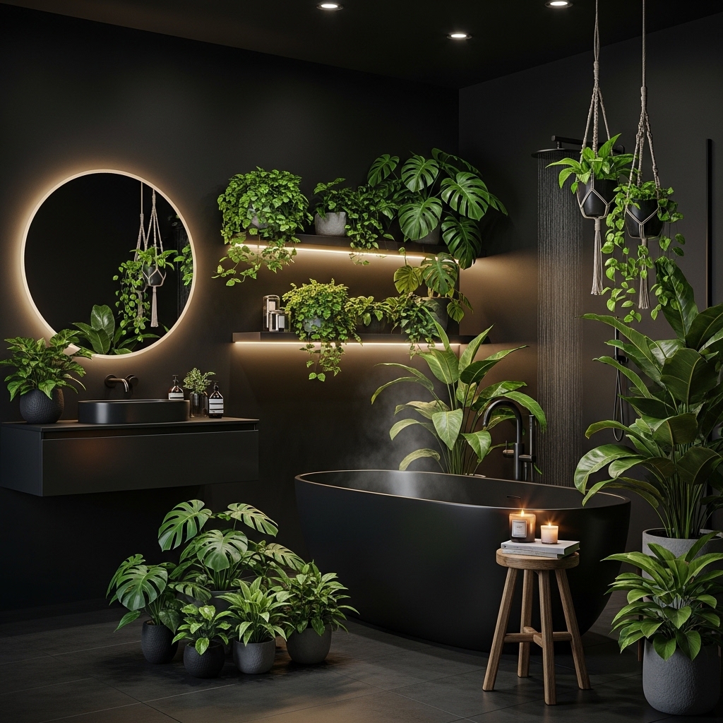 Choose low-light plants like ferns, snake plants, or pothos that thrive in bathroom environments. The greenery pops beautifully against dark walls and enhances the overall aesthetic.