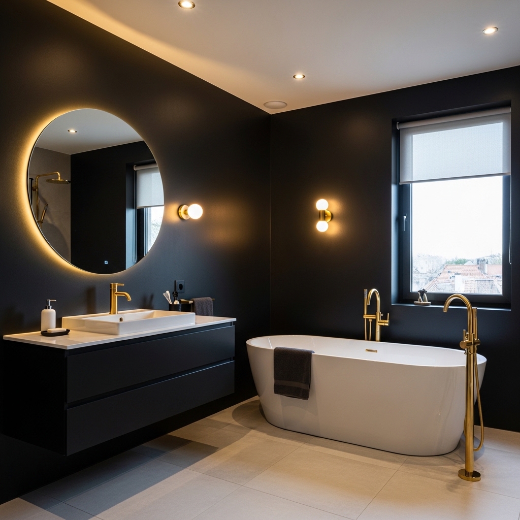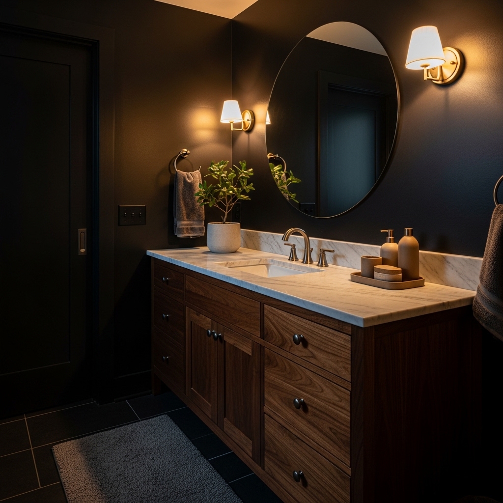 Incorporating dark wood elements—such as vanities, shelves, or ceiling beams—adds warmth and balances the coolness of darker tones.