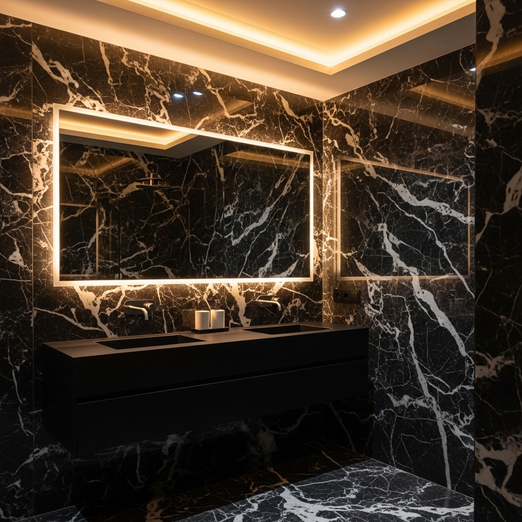 Opt for marble tiles in shades like charcoal, deep green, or black. These materials not only look expensive but also add a spa-like elegance that transforms the entire space.