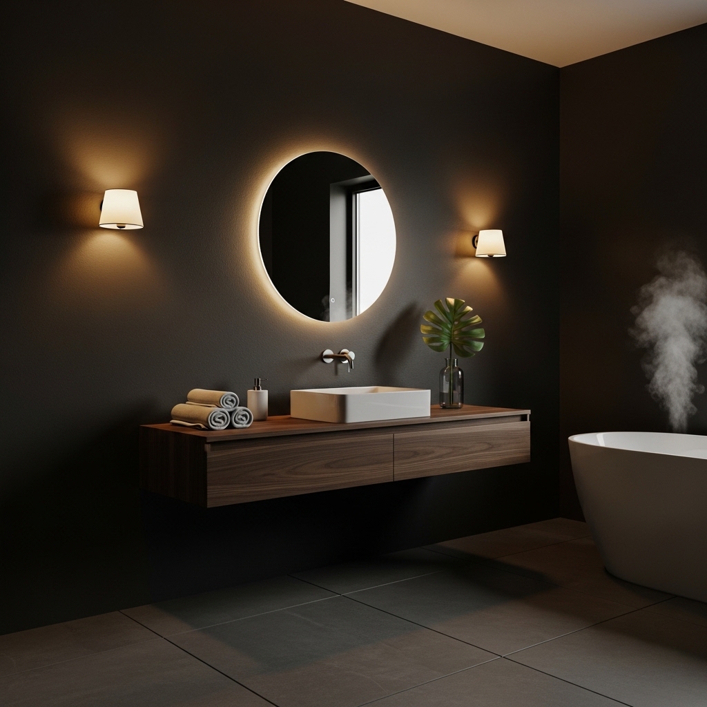 Lighting plays a crucial role in setting the mood. Instead of bright white lights, choose warm, soft lighting to create a cozy atmosphere. Wall sconces, pendant lights, or backlit mirrors work exceptionally well in dark bathrooms.