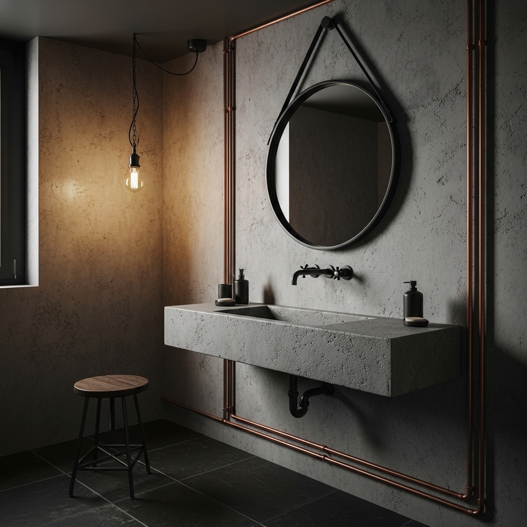 Industrial design pairs beautifully with dark bathrooms. Think exposed pipes, concrete sinks, and metal accents.