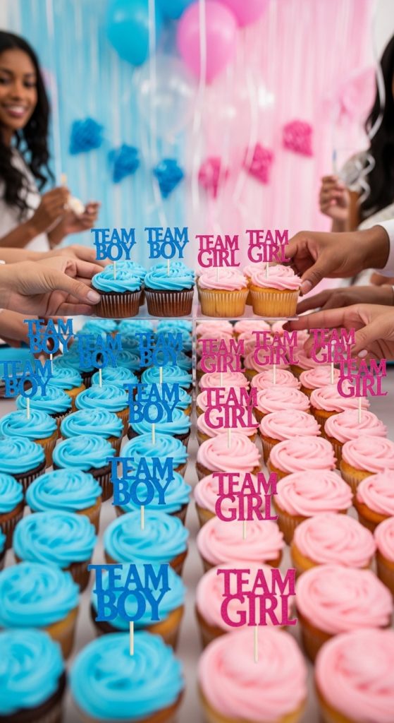 Encourage your guests to join the fun by choosing sides! Cupcake toppers labeled “Team Boy” and “Team Girl” add an interactive element to your party.