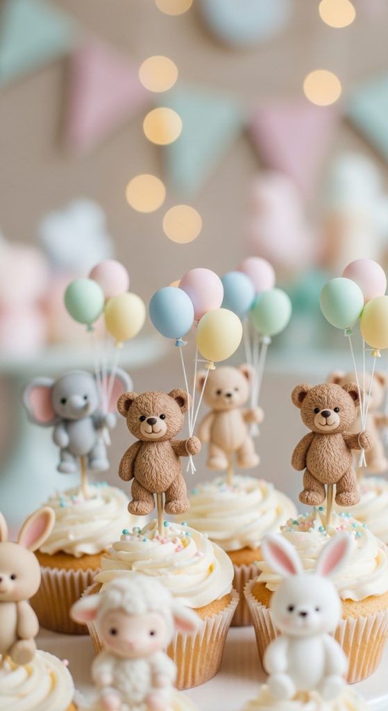 Think teddy bears, elephants, or safari animals holding pink and blue balloons. Animal-themed toppers are perfect for a cute and cozy vibe.