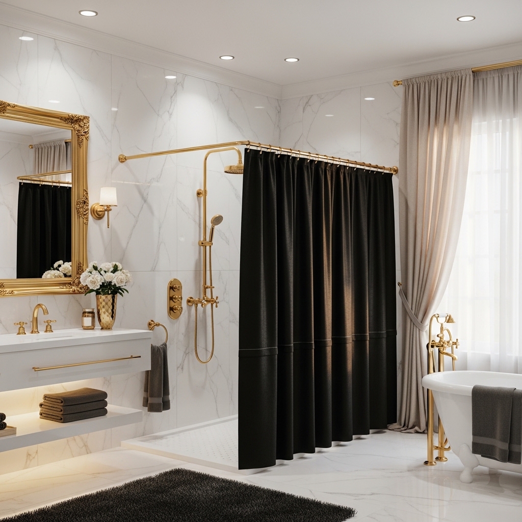 If you want your bathroom to feel luxurious, combine a black shower curtain with gold accents. Think gold-framed mirrors, faucets, and light fixtures. The richness of gold against the depth of black creates a high-end, hotel-like ambiance. This combination works especially well in bathrooms with warm lighting.