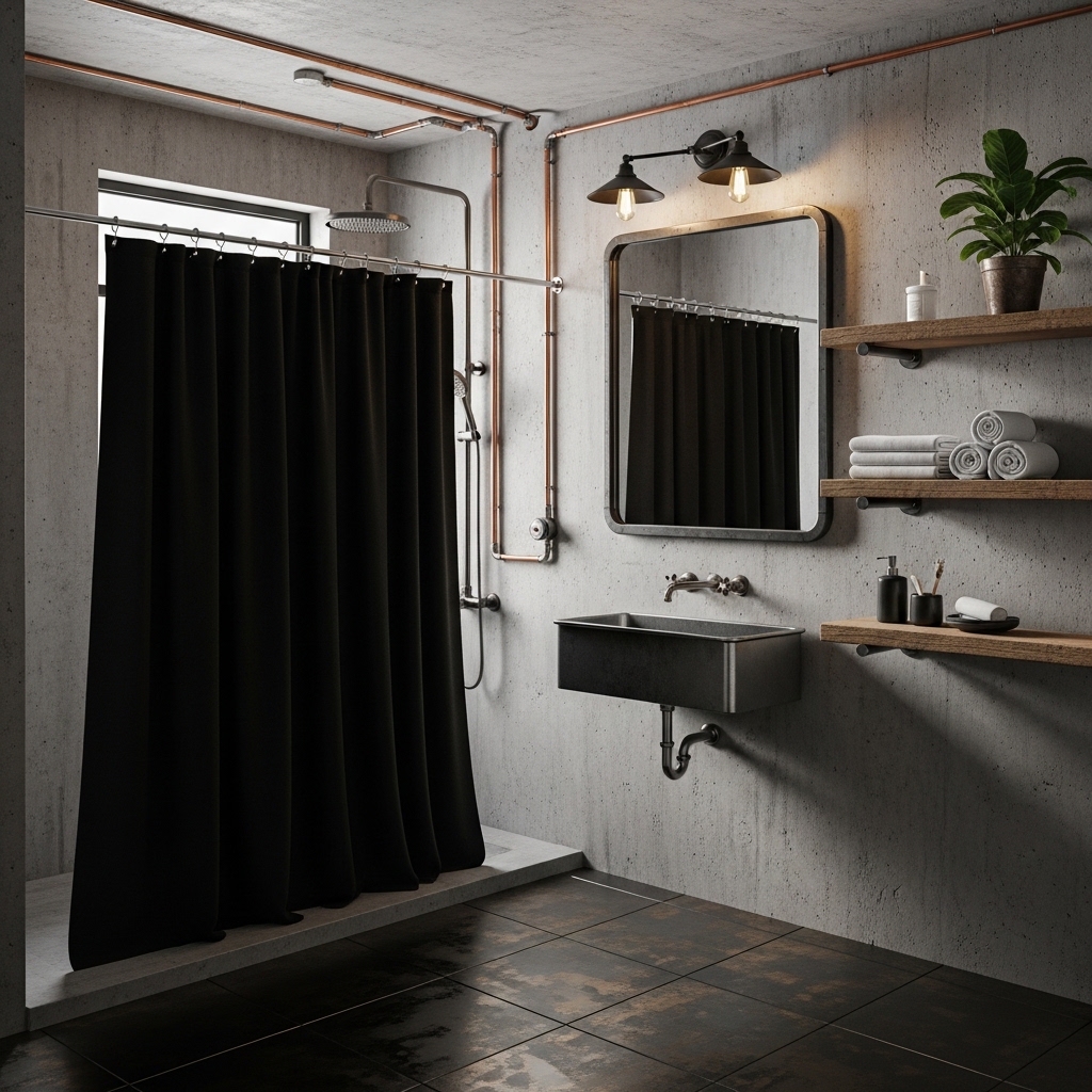 A black shower curtain fits perfectly in an industrial-themed bathroom. Pair it with exposed pipes, concrete walls, and metal fixtures. You can also incorporate wooden elements to soften the look. The curtain acts as a bold anchor that ties all the raw materials together.