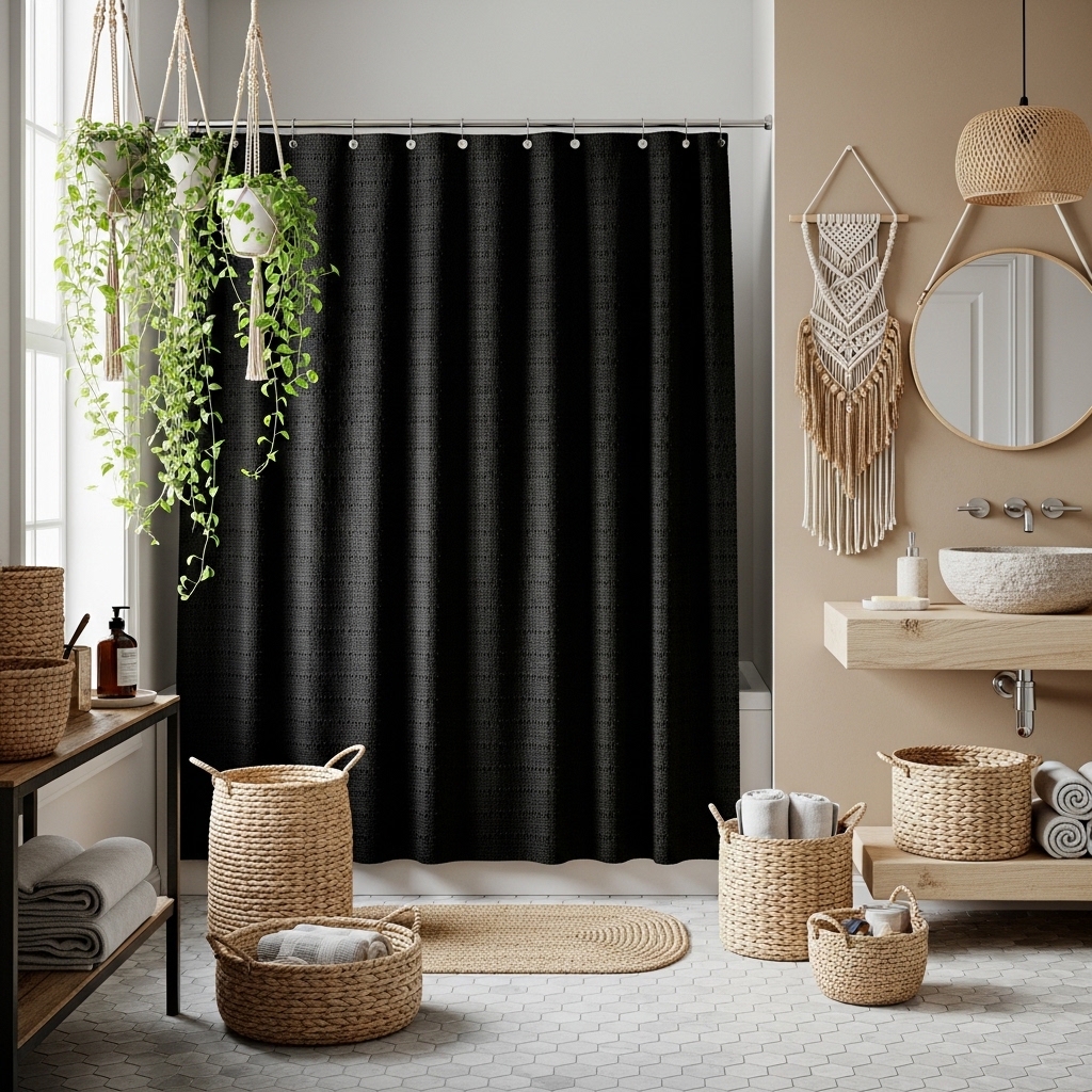 Black doesn’t have to feel heavy. In a boho-style bathroom, a black shower curtain can add contrast to lighter, earthy tones. Combine it with rattan baskets, macramé wall hangings, and greenery. The result is a balanced space that feels both grounded and artistic.