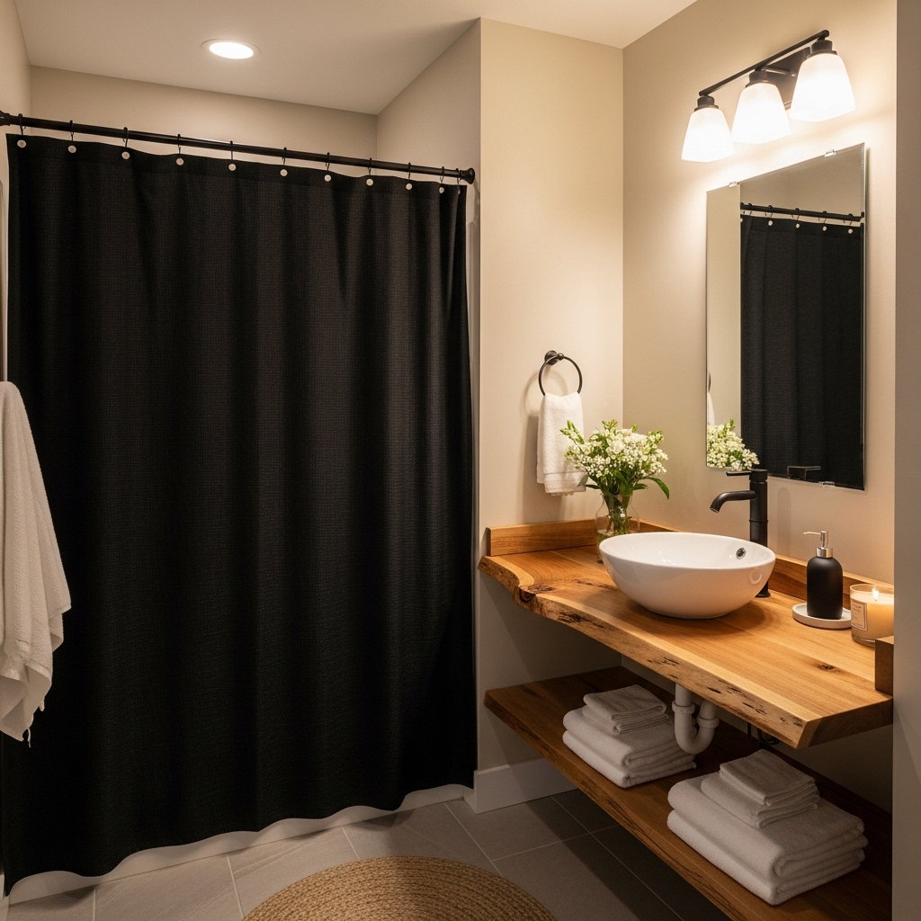 Black and wood is a warm, inviting combination. A black shower curtain paired with wooden shelves, vanities, or flooring creates a cozy yet modern vibe. The natural tones of wood balance the boldness of black, making the bathroom feel more welcoming.
