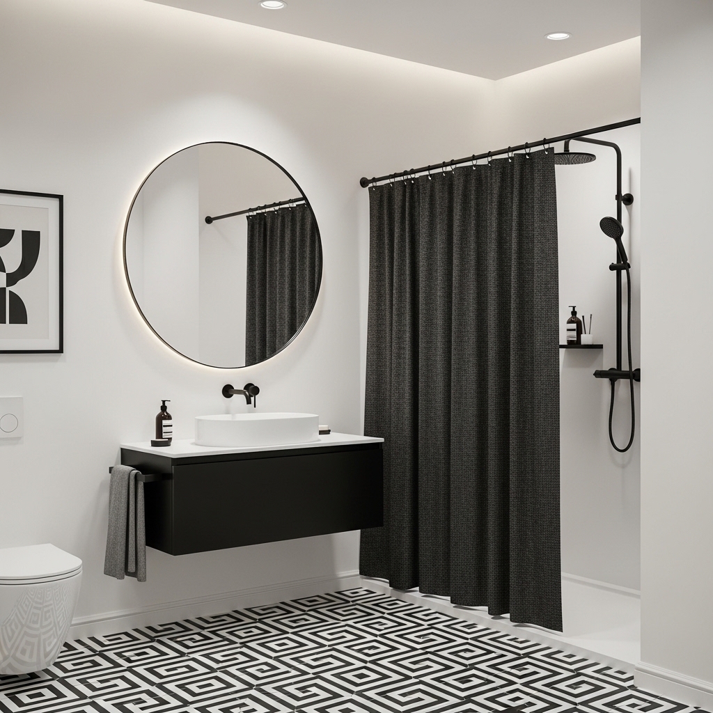 For a sleek, contemporary look, go all-in on matte black. Use a matte black shower curtain along with matching hardware, towel racks, and cabinet handles. Keep the rest of the palette neutral—white, grey, or beige—to prevent the space from feeling too dark.